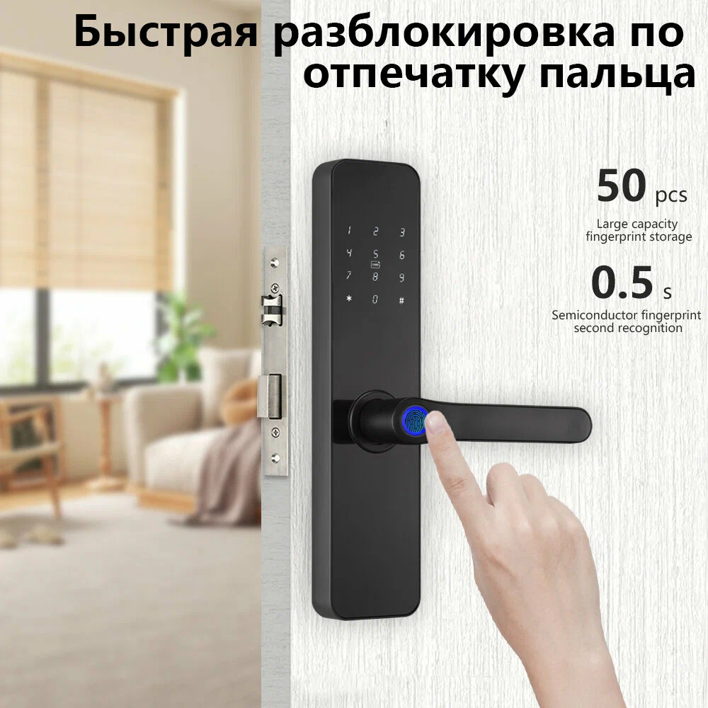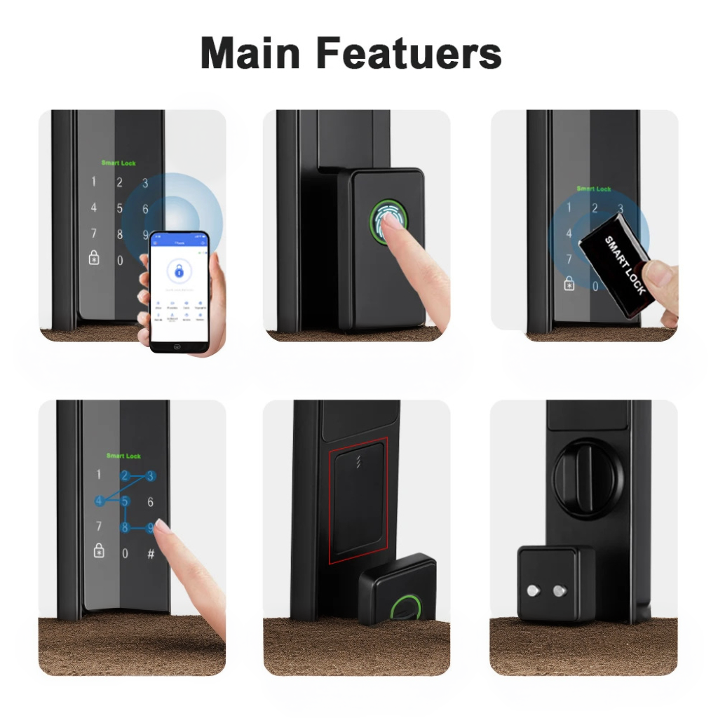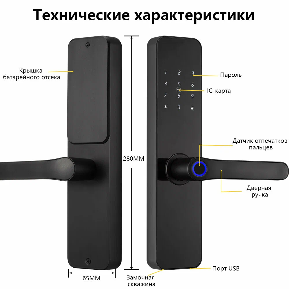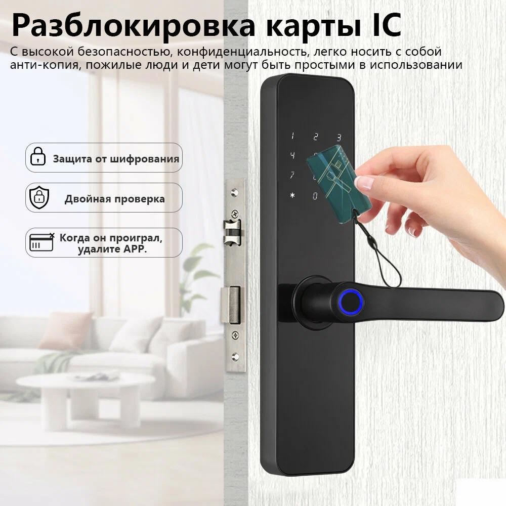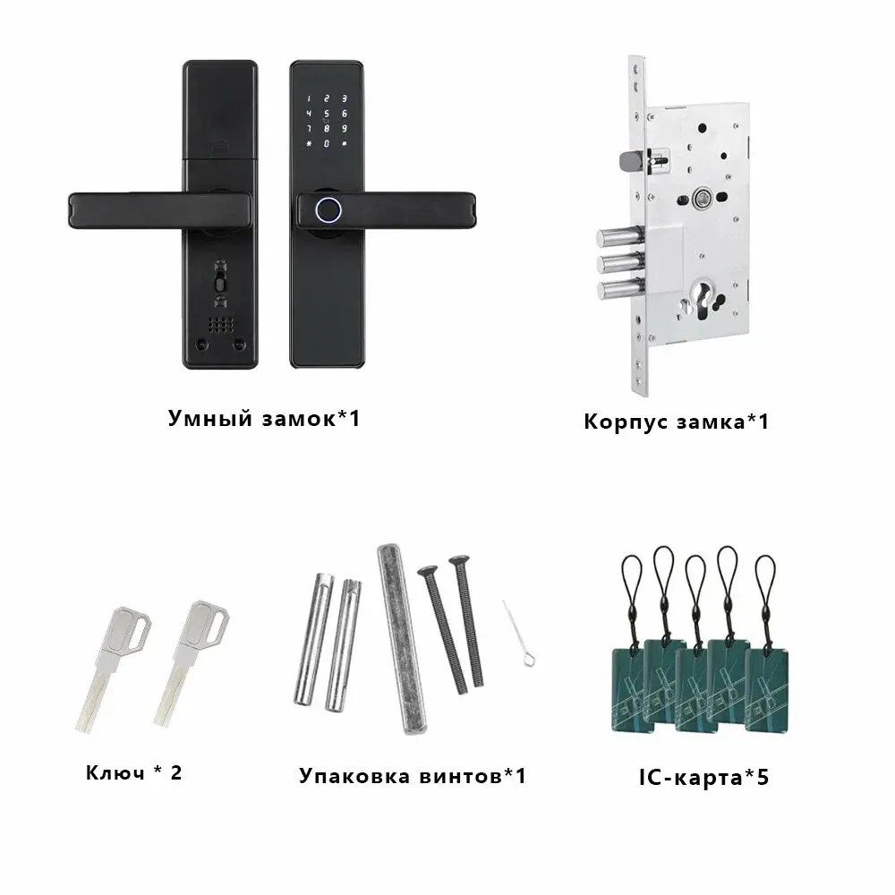 1. Передняя панель матовая и шероховатая, ее нелегко поцарапать. 2. Положение винтов на панели можно гибко изменять, что упрощает установку. 3. 5 методов разблокировки: приложение Tuya/отпечаток пальца/пароль/смарт-карта/разблокировка ключом 4. Управление через приложение Tuya, подключение по Bluetooth, удобно и быстро, прямое добавление или удаление отпечатков пальцев пользователя, паролей, карт в приложении Tuya. 5. Поддерживает подключение к шлюзу, требующему дополнительной покупки. После подключения к шлюзу возможно удаленное управление. 6. Поддержка 9-языковых голосовых систем 7. Внутренняя ручка оснащена электронным замком-выключателем. После открытия разблокировать его может только администратор. 8. Если дверной замок обесточен, вы можете воспользоваться механическим ключом и аварийным источником питания (аварийный источник питания используется только для временной разблокировки и не включает функцию зарядки). 9. Подходит для левых и правых дверей, подходит для толщины двери 30-100 мм. 10. Оснащен дверным замком 28x300 (6068), подходящим для большинства дверей.
