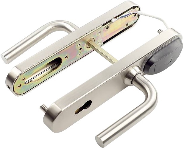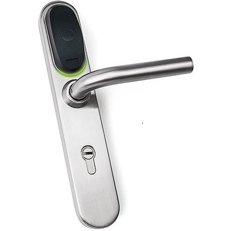 Современный врезной замок с бесконтактным управлением: снаружи открывается по RFID-карте, изнутри — простым нажатием ручки. Встроенный считыватель, автономный контроллер и надёжный запирающий механизм объединены в одном корпусе. Питание — 4 батарейки AA.